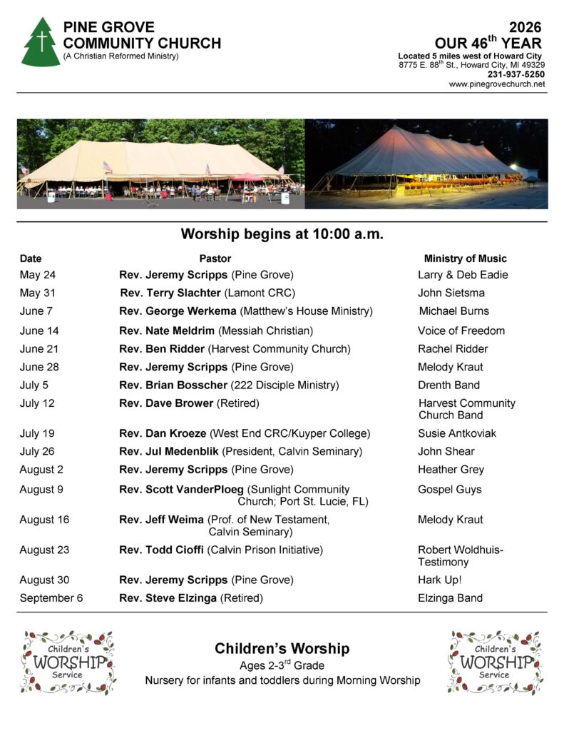 During the summer, we worship under a large tent outside. We are blessed by many guest preachers and musicians who lead Bible based, Christ exalting worship in a more relaxed environment. Nursery is available during all worship services for children up to age two. Also available is Pine Groovy Kids for ages 3-3rd grade.